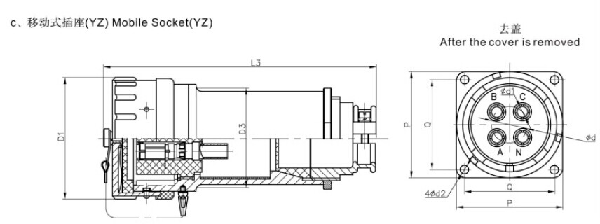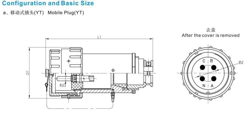 The electric connector consists of two parts:Plug&Socket, of which the plug is mobile(YT).Three kinds of options are made available in the sockets,namely,1 fixed socket(GZ),2 mobile plug(YZ),3 title-type fixed socket(XGZ).Coupling way of the plug and socket is soiral bayonet snap coupling.End connection form between the contacts and wires is crimping.The contacts use elastic rin to support positioning and re the structure of installing from the rear and removing from the front.ZL-102 die-casting alloy is applied in the connector assembly,the contact element is plated with silver,which ensured reliable contact,convenient wiring,better air tightness & insulation,together with such features are waterproof,dust prevention,shockproof,etc.